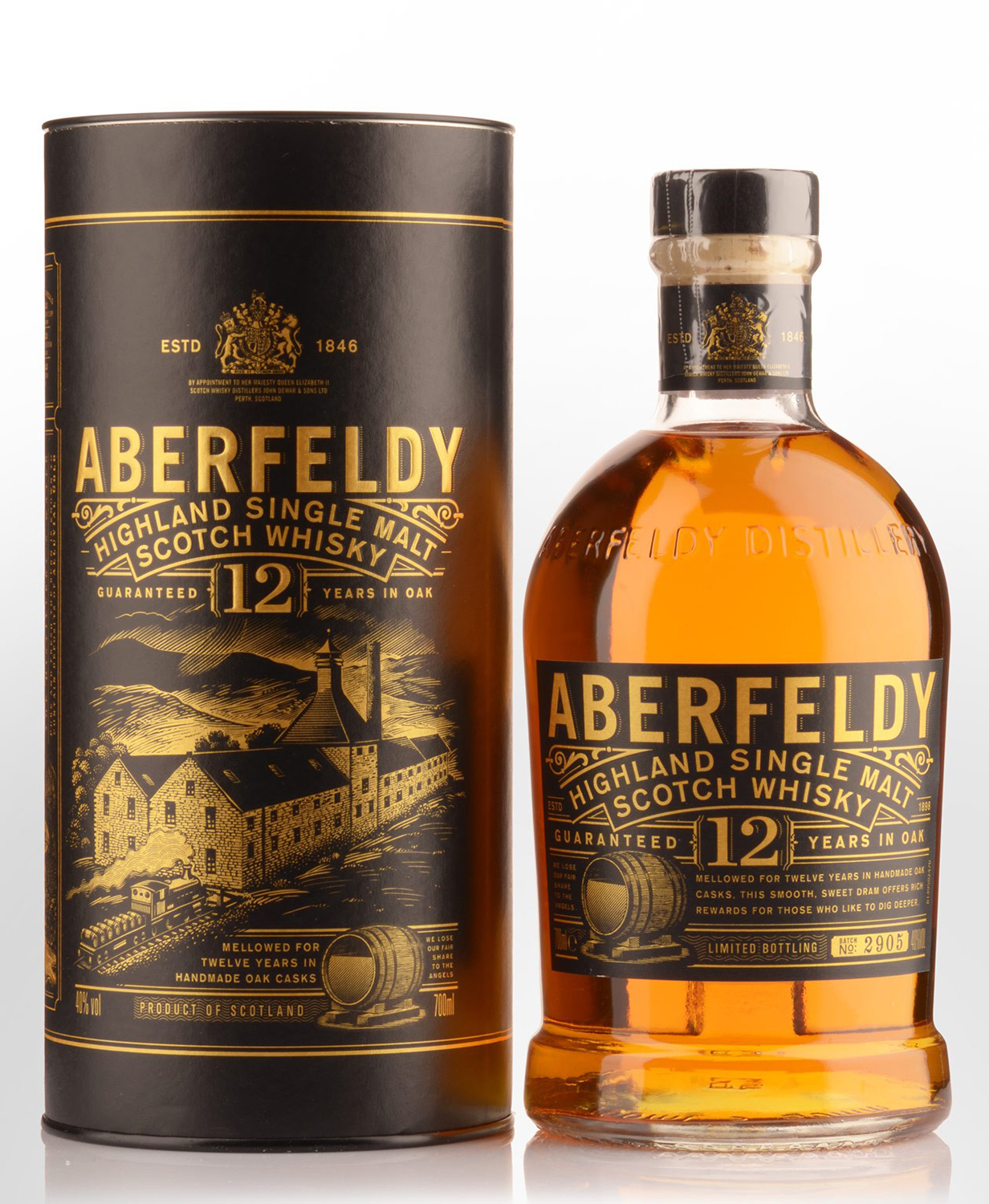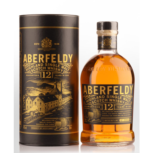 This whisky is the flagship single malt from the Highland distillery of Aberfeldy. It has just recently been re-launched with new packaging and focuses on numerous aspects of the distillery's history and heritage, with the gold lettering paying homage to the discovery of gold particles in the local river.  Built by the Dewar family in 1898 on the edge of Highland Perthshire, Aberfeldy Distillery produces a fine and sophisticated Highland single malt Scotch whisky. Reserved for years as the heart of DEWAR'S blends, limited quantities of Aberfeldy single malt whisky are now available.