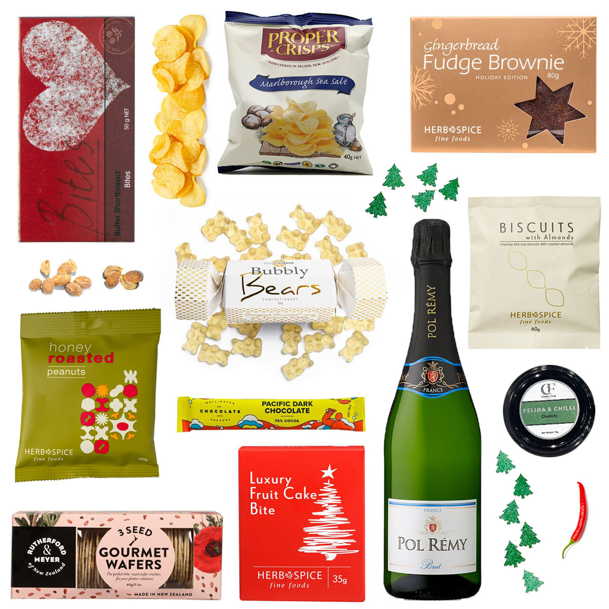 Christmas fizz and a selection of tasty Christmas themed goodies presented in a stylish hamper....All wrapped up in a bow.