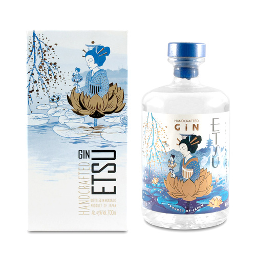 Etsu Japanese Gin is made at the Asahikawa Distillery located on the Japanese island of Hokkaido. The botanicals macerate in neutral cane spirit for 24 hours before distillation in a copper pot still. These botanicals include tea leaves, yuzu, green bitter orange peel, coriander, licorice, and angelica root in addition to juniper. Brought down to 43% ABV with water from the Taisetsu Mountains.
