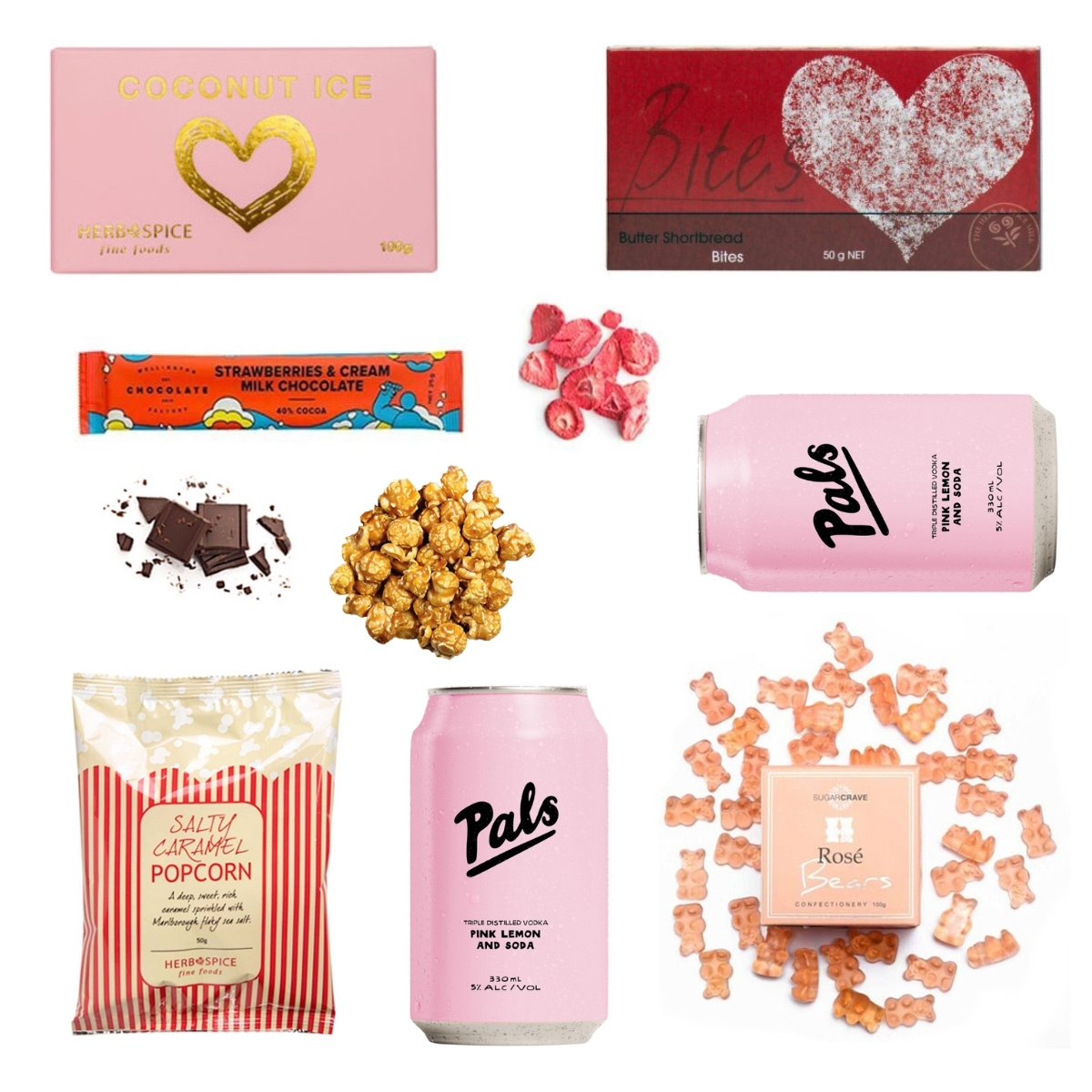 Pals RTD Vodka Pink Lemon & Soda wine hamper gift. Packed full of delicious foodie treats. All presented in a premium box and hand tied bow