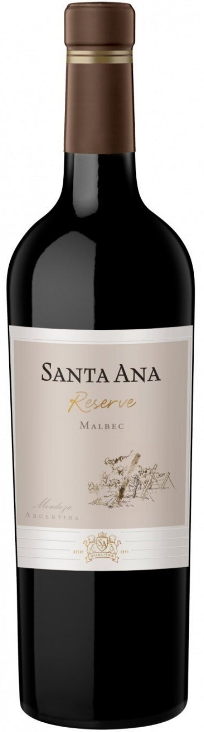 "Santa Ana Reserve Malbec, aged in French and American oak for six months, displays a purple colour in the glass. The nose offers up pain grillé, minerals, plums and black cherries notes with a touch of black pepper. The palate is soft and round, with ripe, saturated berry flavours. It displays a spicy full finish with chewy tannins."