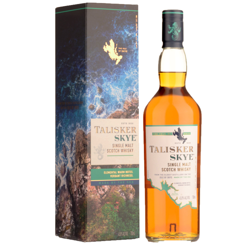 "TALISKER SKYE is the latest release from the windswept distillery on the Isle of Skye. The island’s challenging landscape is richly varied yet always beautiful, from softer shores, to the dark jagged hills of the Cuillin and the remote peninsulas in the North. Imagine a single malt of such contrasts and you have TALISKER SKYE. The liquid has been made from a combination of toasted and refill American oak casks to accentuate the citrus and sweeter notes of Talisker, whilst delivering the gentle smoky and salty flavours that are so unique to whiskies from the distillery."