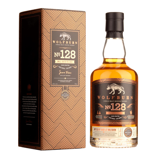 The aroma of this Wolfburn is very fresh (a sea-side breeze) and lively, with notes of dried apples, nutmeg and sweet vanilla pod. There is a subtle background tang of peat smoke on the palate that has a very waxy and oily feeling, carrying butter toffee, dried apricots and candied orange zest with a surprisingly rich, earthy feel.